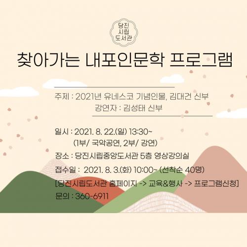 À̹ø ã¾Æ°¡´Â ³»Æ÷ Àι®ÇÐ ÇÁ·Î±×·¥ Âü¿© ½ÅûÀº ´çÁø½Ã¸³µµ¼°ü ȨÆäÀÌÁö(http://www.dangjin.go.kr/lib.do)¸¦ ÅëÇØ °¡´ÉÇϸç, ÀÚ¼¼ÇÑ »çÇ×Àº ½Ã¸³µµ¼°ü »ç¼ÆÀ(360-6911)À¸·Î ¹®ÀÇ °¡´ÉÇÏ´Ù.