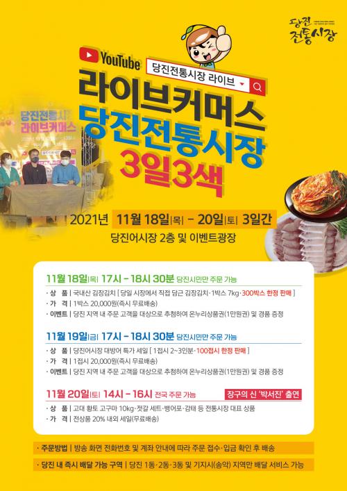 18Àϰú 19ÀÏ¿¡´Â ¿ÀÈÄ 5½ÃºÎÅÍ 6½Ã 30ºÐ±îÁö °¢°¢ ±¹³»»ê Àç·á·Î¸¸ ¸¸µç ±èÀå±èÄ¡(300¹Ú½º ÇÑÁ¤)¿Í ´ë¹æ¾îȸ(100Á¢½Ã ÇÑÁ¤)¸¦ ¿Â¶óÀÎ(À¯Æ©ºê °Ë»ö: ´çÁøÀüÅë½ÃÀå ¶óÀ̺ê)À¸·Î¸¸ ÆÇ¸ÅÇϰí, 20ÀÏ¿¡´Â À峯À» ¸Â¾Æ À̺¥Æ®±¤Àå¿¡¼ ¿ÀÈÄ 2½ÃºÎÅÍ 4½Ã±îÁö ´çÁøÀÇ ´ëÇ¥»óǰÀÎ °í´ë ȲÅä °í±¸¸¶, Á£°¥¼¼Æ®, ¹ð¾îÆ÷, °¨Å µîÀ» ÃÖ´ë 20% ÇÒÀÎÇØ ¿Â¡¤¿ÀÇÁ¶óÀÎÀ¸·Î ½Ç½Ã°£ ÆÇ¸ÅÇÒ ¿¹Á¤ÀÌ´Ù.