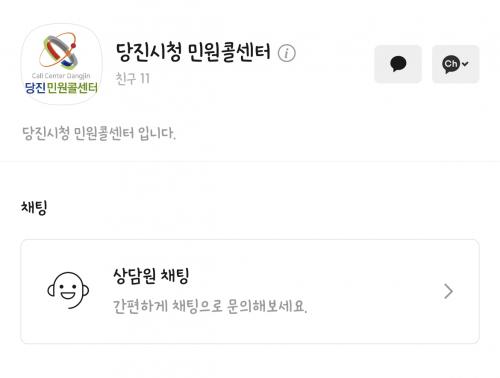 ÇÑÆí ´çÁø½Ã ¹Î¿øÄݼ¾ÅÍ´Â À۳⵵¿¡¸¸ ÃÑ 11¸¸9815°ÇÀ» »ó´ãÇÏ¸ç ½Ã¹Î°úÀÇ ¼ÒÅëⱸ·Î½áÀÇ ¿ªÇÒÀ» ÅåÅåÈ÷ Çϰí ÀÖÀ¸¸ç, īī¿ÀÅå äÆÃ »ó´ã ¼ºñ½º´Â ¾÷¹«½Ã°£(¿ÀÀü 9½Ã~¿ÀÈÄ 6½Ã)¿¡ ½Ç½Ã°£À¸·Î ¿î¿µµÇ¸ç, īī¿ÀÅå ä³Î °Ë»ö¿¡¼ ¡®´çÁø½Ãû ¹Î¿øÄݼ¾ÅÍ¡¯¸¦ °Ë»öÇϰí ä³ÎÀ» Ãß°¡¸¦ ÇÏ¸é ¼ºñ½º¸¦ »ç¿ëÇÒ ¼ö ÀÖ´Ù.