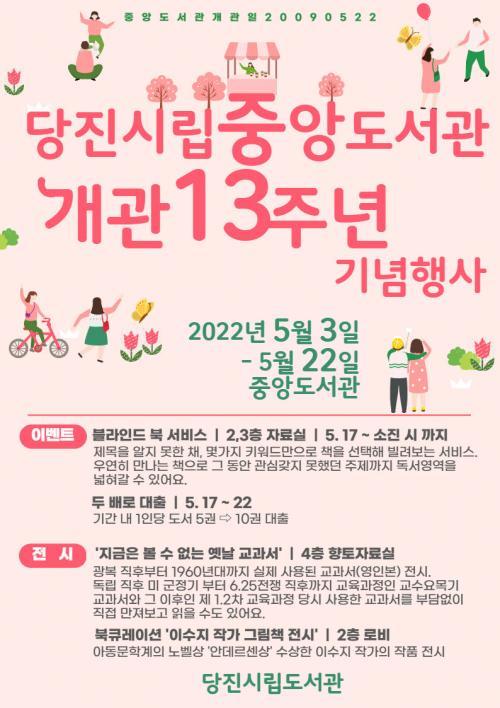 ÇÑÆí À̹ø °³°ü 13Áֳ⠱â³äÇà»ç´Â ÀÌ´Þ 22ÀϱîÁö ÁøÇàµÉ ¿¹Á¤ÀÌ¸ç ±âŸ ¹®ÀÇ»çÇ×Àº ´çÁø½Ã¸³Áß¾Óµµ¼°ü(¢Ï041-360-6913)À¸·Î ¹®ÀÇÇÏ¸é µÈ´Ù.