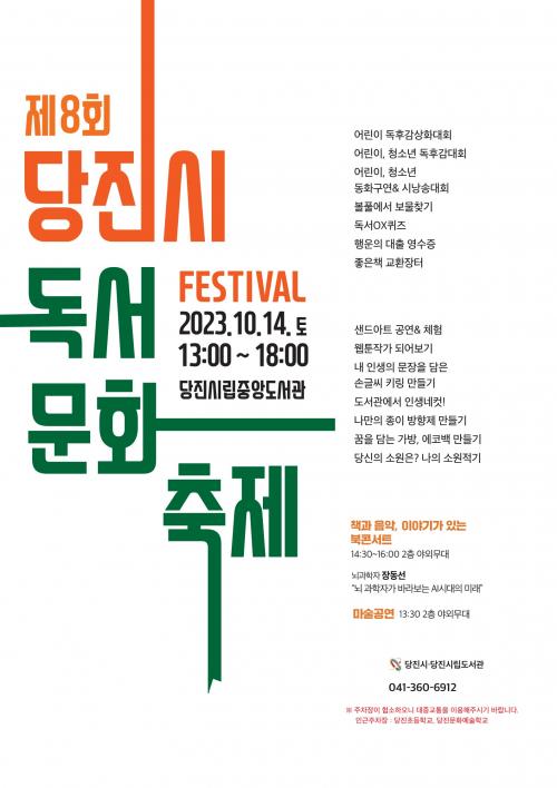 Á¦8ȸ ´çÁø½Ã µ¶¼¹®ÈÃàÁ¦¿¡ ´ëÇÑ ÀÚ¼¼ÇÑ »çÇ×Àº ȨÆäÀÌÁö(www.dangjin.go.kr/lib.do)¸¦ ÂüÁ¶Çϰųª ´çÁø½Ã¸³µµ¼°ü »ç¼ÆÀ(041-360-6912)À¸·Î ¹®ÀÇÇÏ¸é µÈ´Ù.
