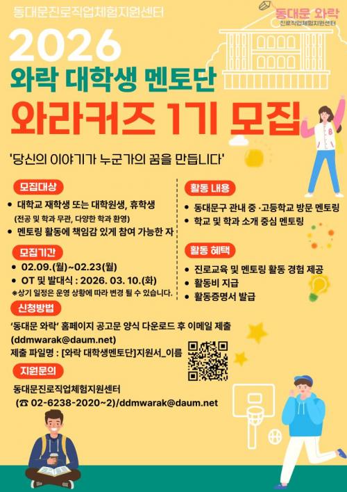 À̹ø ¸ðÁýÀº µ¿´ë¹®±¸ Áß¡¤°íµîÇлýµé¿¡°Ô º¸´Ù Çö½ÇÀûÀÎ Áø·Î ¹× Çаú Á¤º¸¸¦ Á¦°øÇϰí, ´ëÇлý ¸àÅäµéÀÇ ½ÇÁ¦ °æÇèÀ» ¹ÙÅÁÀ¸·Î Áø·Î ¼³°è¿¡ µµ¿òÀ» ÁÖ°íÀÚ ±âȹµÆ´Ù. ¼±¹ßµÈ ¿Í¶óÄ¿Áî(WARAKERS)´Â Áö¿ª ³» Áß¡¤°íµîÇб³¸¦ ¹æ¹®ÇØ Çб³ ¹× Çаú ¼Ò°³¸¦ Áß½ÉÀ¸·Î ÇÑ ¸àÅ丵 Ȱµ¿À» ÁøÇàÇÒ ¿¹Á¤ÀÌ´Ù.